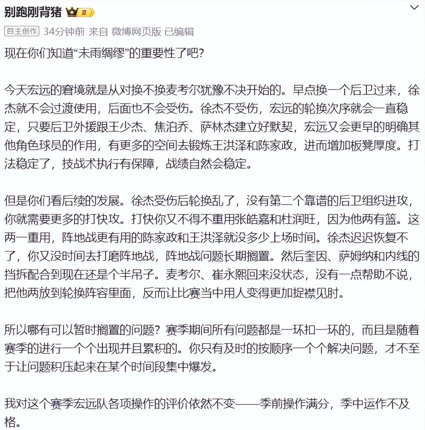 别跑刚背猪则把矛头指向了麦考尔:今天宏远的窘境就是从对换不换麦考尔犹豫不决开始的。早点换一个后卫过来,徐杰就不会过度使用,后面也不会受伤。徐杰不受伤,宏远的轮换次序就会一直稳定,只要后卫外援跟王少杰、焦泊乔、萨林杰建立好默契,宏远又会更早的明确其他角色球员的作用,有更多的空间去锻炼王洪泽和陈家政,进而增加板凳厚度。打法稳定了,技战术执行有保障,战绩自然会稳定。